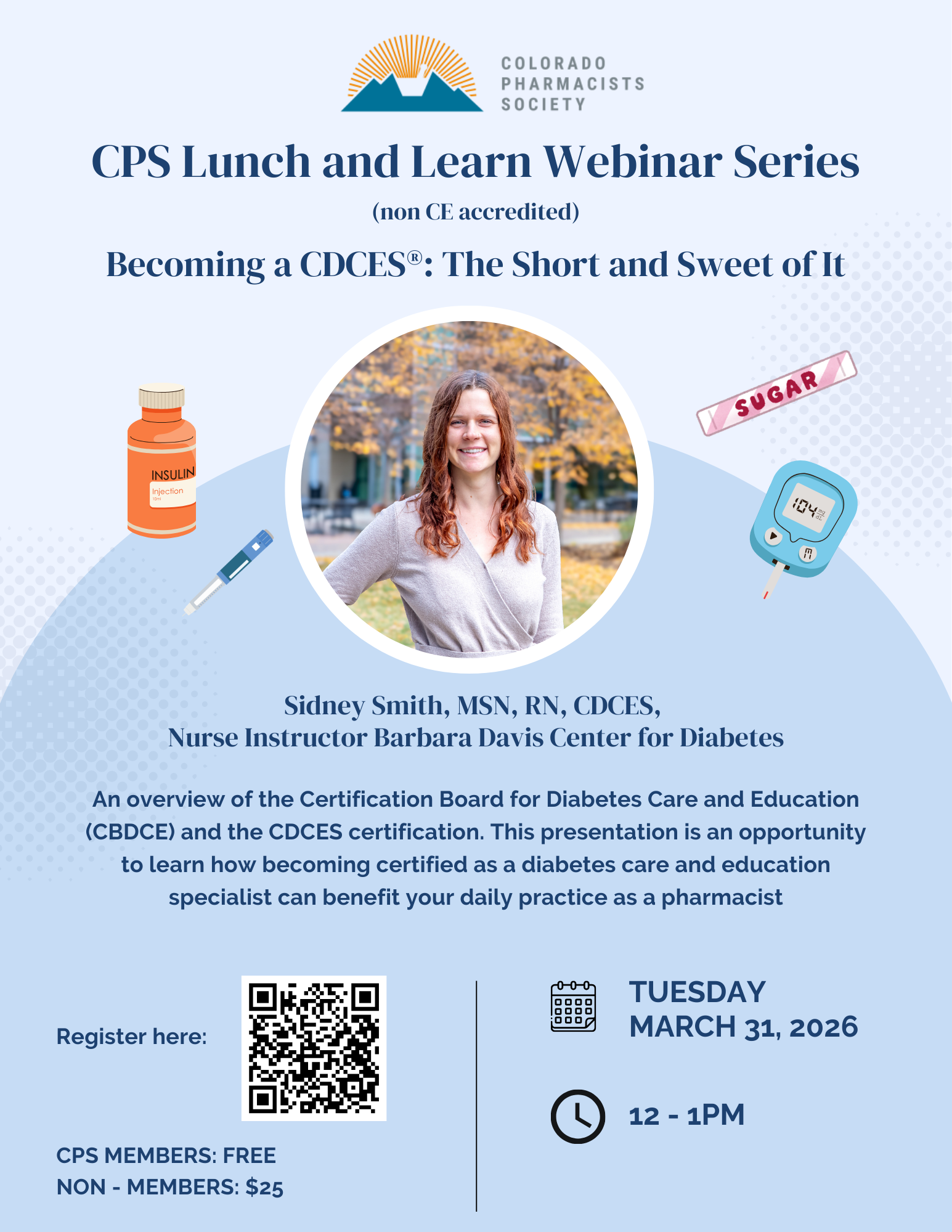 The Colorado Pharmacists Society is pleased to present quarterly webinars based on topics relevant to pharmacists in Colorado and nationwide. Registration for all webinars will be linked below. Recordings and presentation slides will be available after each webinar. Each webinar is free for members and just $25 for nonmembers. Please find a list of past CPS webinars below. Active CPS members can access recordings of these webinars for free. If you are not an active member of CPS, please email [email protected] to purchase access to webinar recording(s) or for more information about joining!